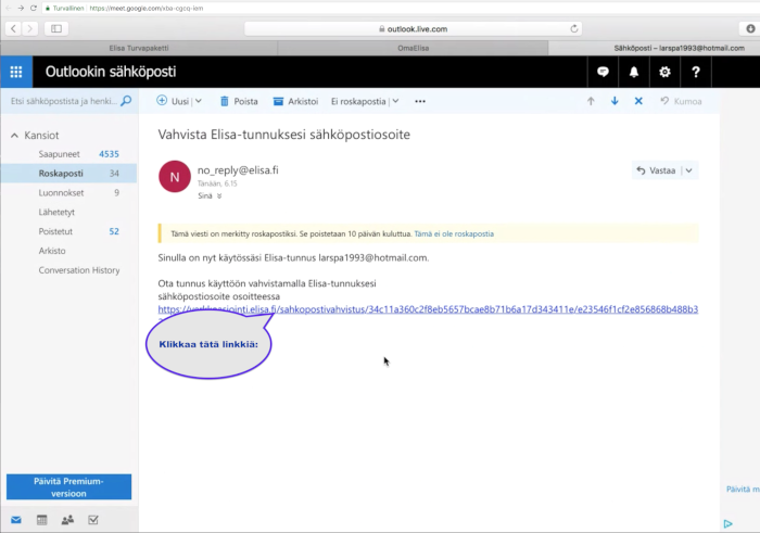 5. Palaa takaisin sähköpostiisi ja avaa Elisan lähettämä vahvistusviesti. Viesti voi joskus löytyä ROSKAPOSTISTA tai SAAPUNEET postilaatikosta:
